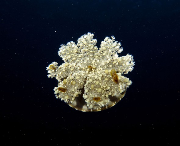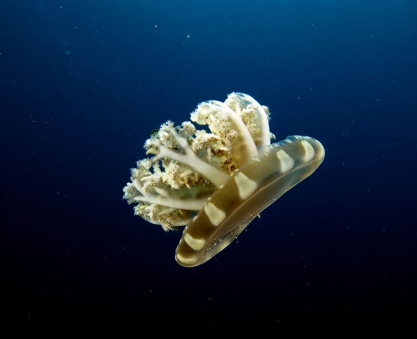 A Cassiopeia Andromeda, perhaps more for that ancient divine punishment, was taken off the only defense system jellyfish and today is located in the sandy bottom of the deep sea to wander silent without being able to defend. All this for the ancient vice of vanity . To tell the truth, seeing it resting on the sandy bottom is not as beautiful as it claims to be but if only it will be diverted from laziness and offered the possibility of floating in mid-water then you will have a taste of its splendor and we will see the vain Cassiopeia as beautiful as it is superb.