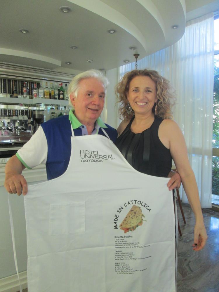 Dopo aver visitato l’Acquario di Cattolica, Gino Landi si è molto divertito con Katia Battistelli proprietaria dell’ Hotel Universal ( nella foto) che ha ospitato il Maestro, omaggiandolo del libro, “A tavola con Fellini” l’opera di Maddalena Fellini sulle ricette romagnole che amava Federico e del grembiule con la ricetta della piadina romagnola, da lui apprezzatissima. Tra i regali del Sindaco, anche un accappatoio “I love Cattolica” e tanti libri sulla città.
