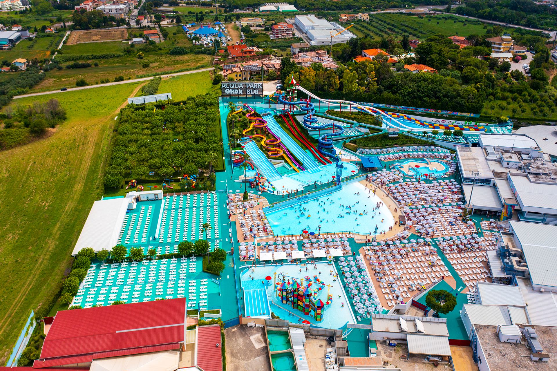 È dotato di numerose piscine, scivoli e aree tematiche, pensate per rispondere alle esigenze di bambini, giovani e adulti. Tra le attrazioni principali si segnalano la Piscina Onde, gli scivoli ad alta velocità Kamikaze e Crazy Kamikaze, oltre a percorsi acquatici come Blue Hole, Twist e i toboga Drop e Boa.