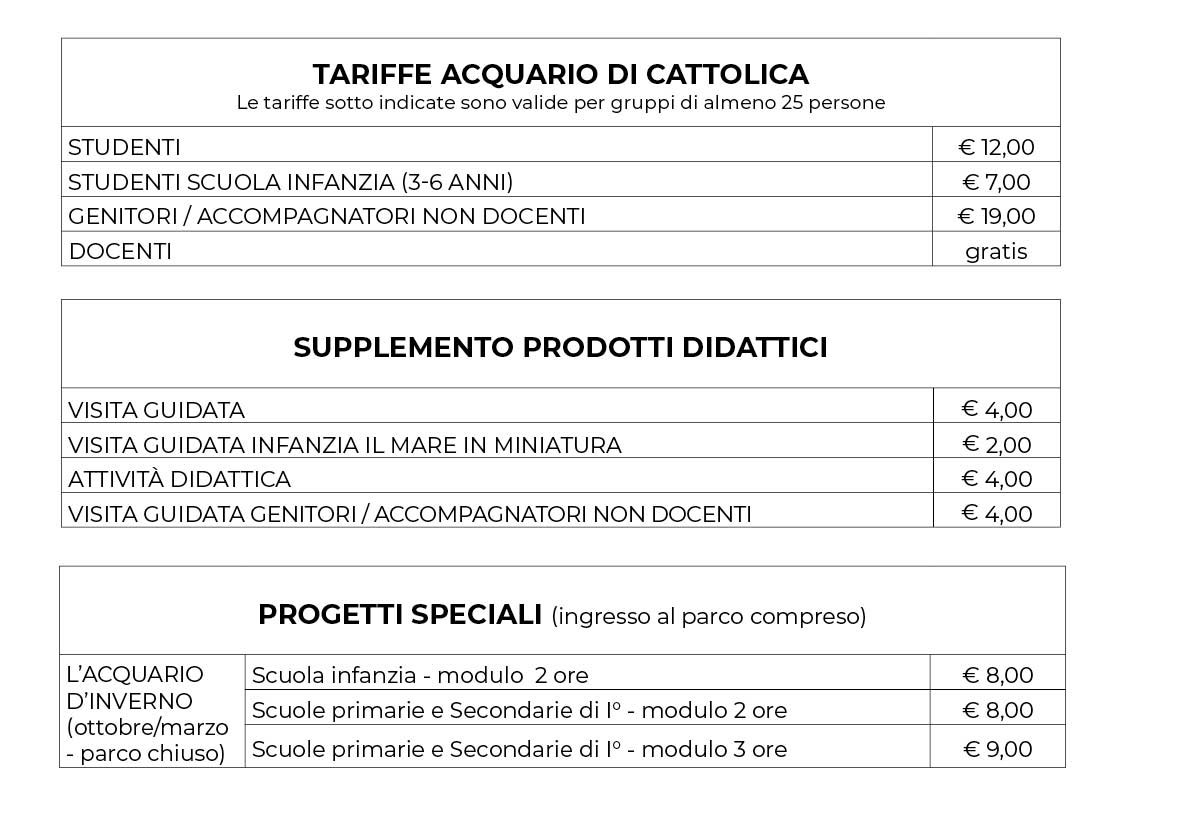 - Dal 1 ottobre 2025 alla riapertura ufficiale dell’Acquario le attività didattiche verranno svolte dal lunedì al venerdì, nei mesi di ottobre, novembre e marzo. Dalla riapertura ufficiale dell’Acquario, le attività didattiche verranno svolte tutti i giorni dal lunedì al sabato fino alla prima settimana di giugno, esclusivi festivi e prefestivi.