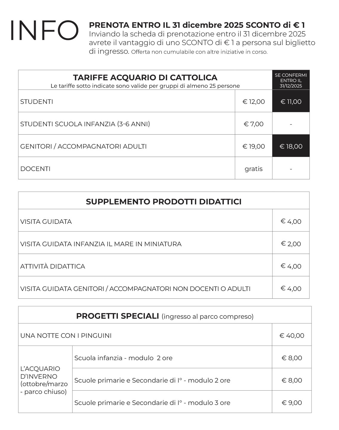 - Formule di pagamento: CONTANTI e BONIFICO BANCARIO ANTICIPATO. La copia contabile del Bonifico dovrà pervernire almeno 4 gg. LAVORATIVI prima della visita, al netto delle spese bancarie, via email booking@acquariodicattolica.it.